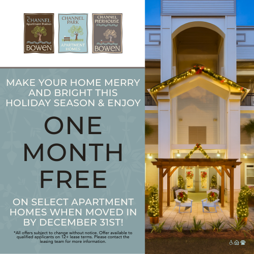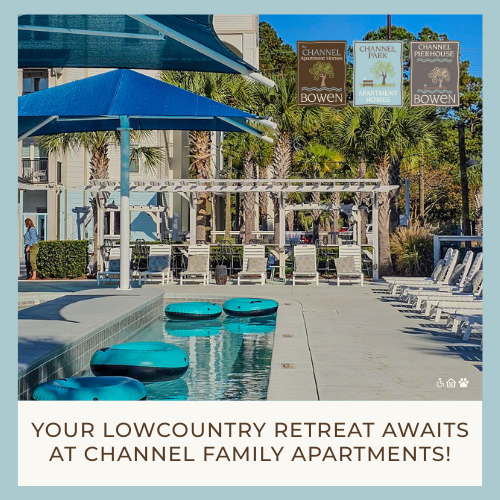 The Channel Family Apartment Homes are situated in the award-winning Bowen Waterfront Village compiled of residential and commercial destinations. Delivering an unparalleled southern aesthetic and hallmark amenities, choose from a plethora of studio, 1, 2, and 3-bedroom open-concept apartment home floorplans boasting the essential desired features. Life at Channel Family Apartment Homes is unmatched. Schedule your personal tour of paradise today!
